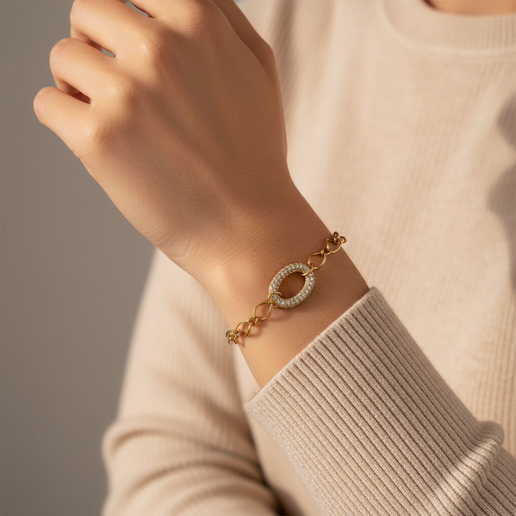 Το Luxe Oval Shine συνδυάζει κομψή αλυσίδα από ατσάλι με ένα εντυπωσιακό οβάλ στοιχείο γεμάτο στρας — ένα διακριτικό statement που φοριέται άνετα από το πρωί μέχρι το βράδυ.