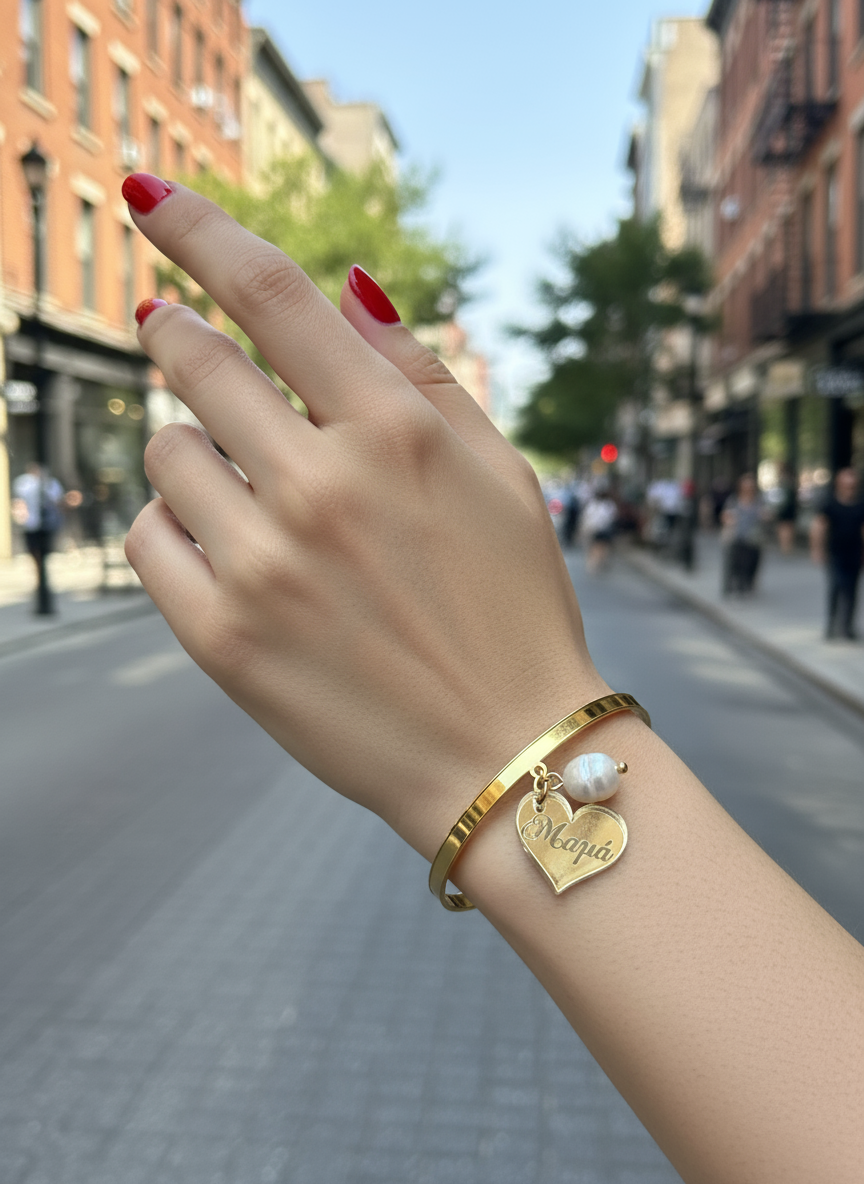 Η μεταλλική χειροπέδα αγκαλιάζει τον καρπό με διακριτική λάμψη, ενώ η πλεξιγκλάς καρδιά με χάραξη “Mama” και η φυσική πέρλα προσθέτουν ρομαντισμό και φινέτσα.