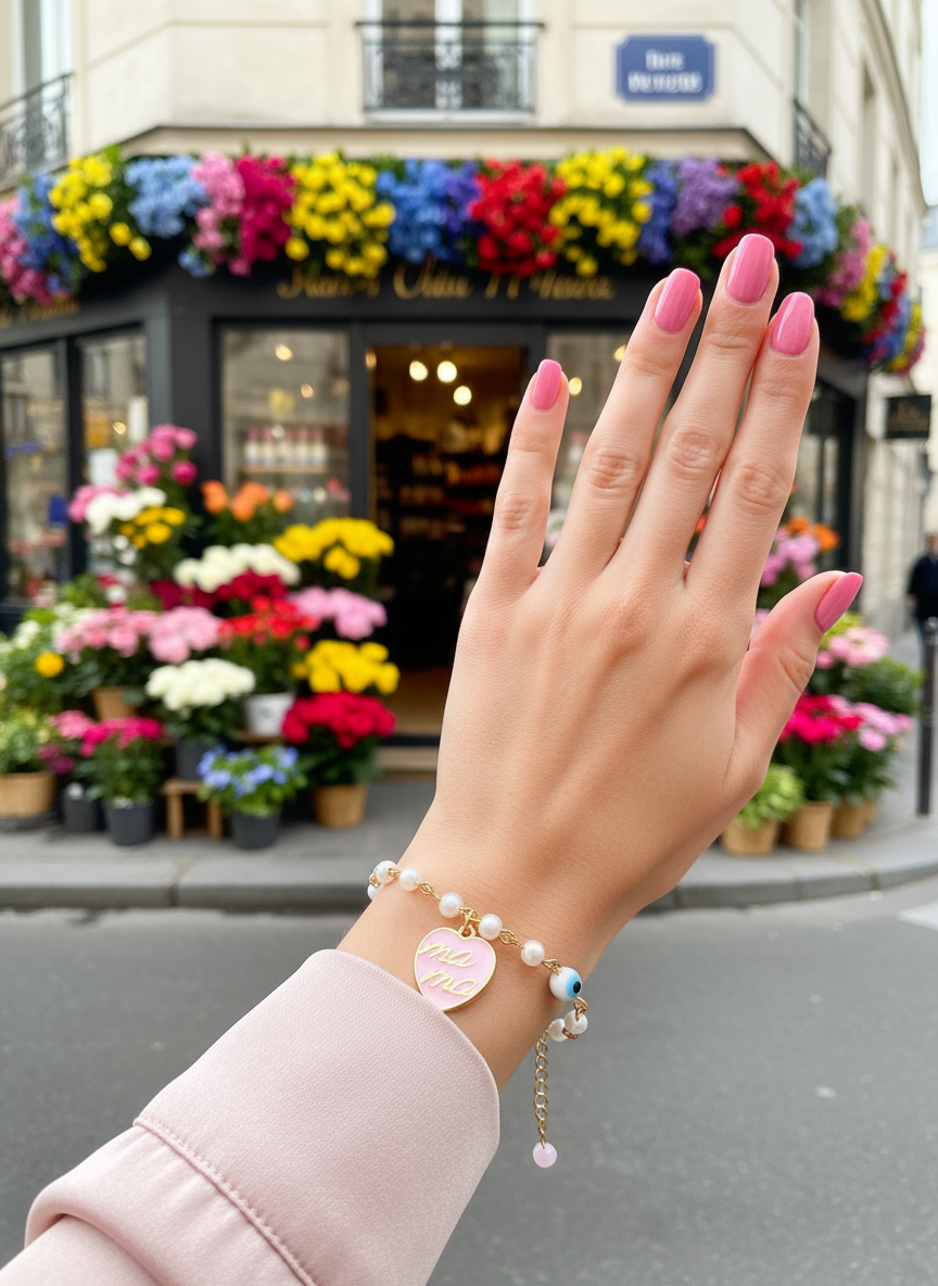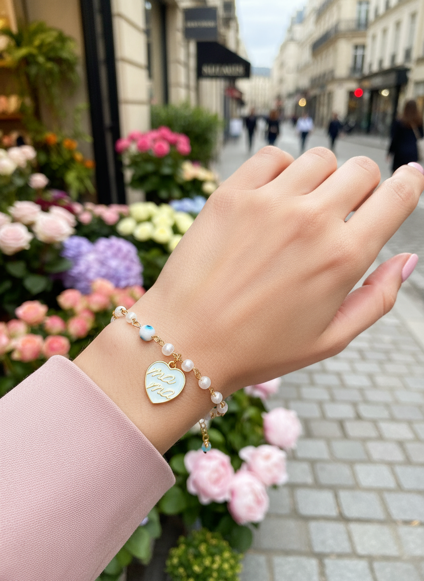 Το Mama Heart Rosary Bracelet είναι ένα χειροποίητο βραχιόλι–ροζάριο με γυάλινες πέρλες, ματάκι και καρδιά από σμάλτο με χάραξη “Mama”.