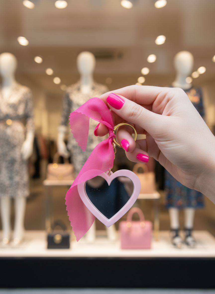 Ένα μπρελόκ που συνδυάζει χρήση και στυλ — γιατί μπορείς να ρίχνεις μια ματιά στον καθρέφτη σου οπουδήποτε! Από τη μία πλευρά έχει καθρεφτάκι, κι από την άλλη το iconic logo Miu Miu, για στιγμές πολυτέλειας με girly διάθεση. Η φούξια κορδέλα οργάντζας δίνει το πιο cute τελείωμα 💅✨