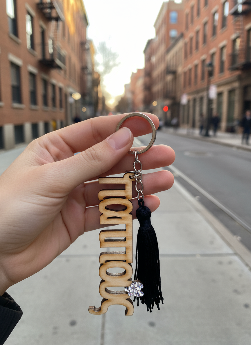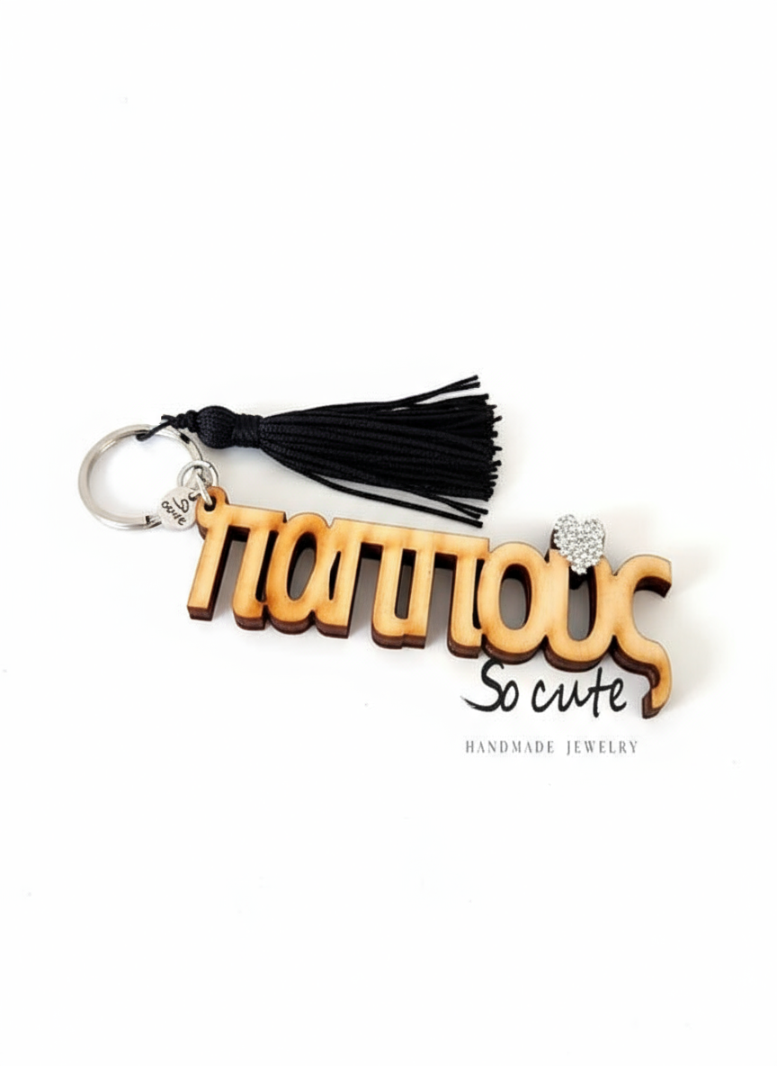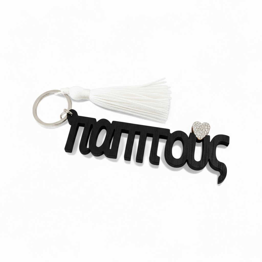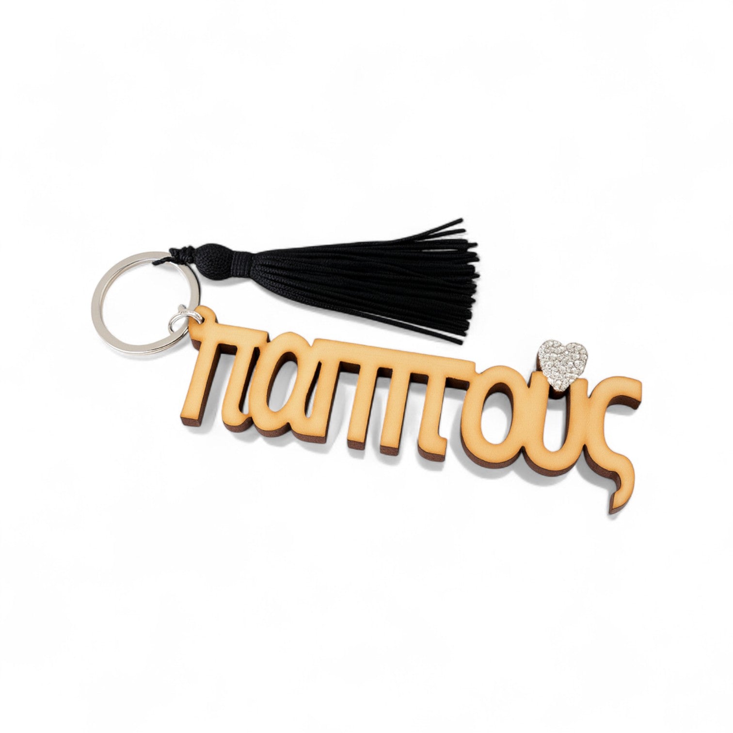 Χειροποίητο μπρελόκ με ξύλινη επιγραφή “Παππούς”, φούντα και λαμπερή καρδιά στο τελείωμα.