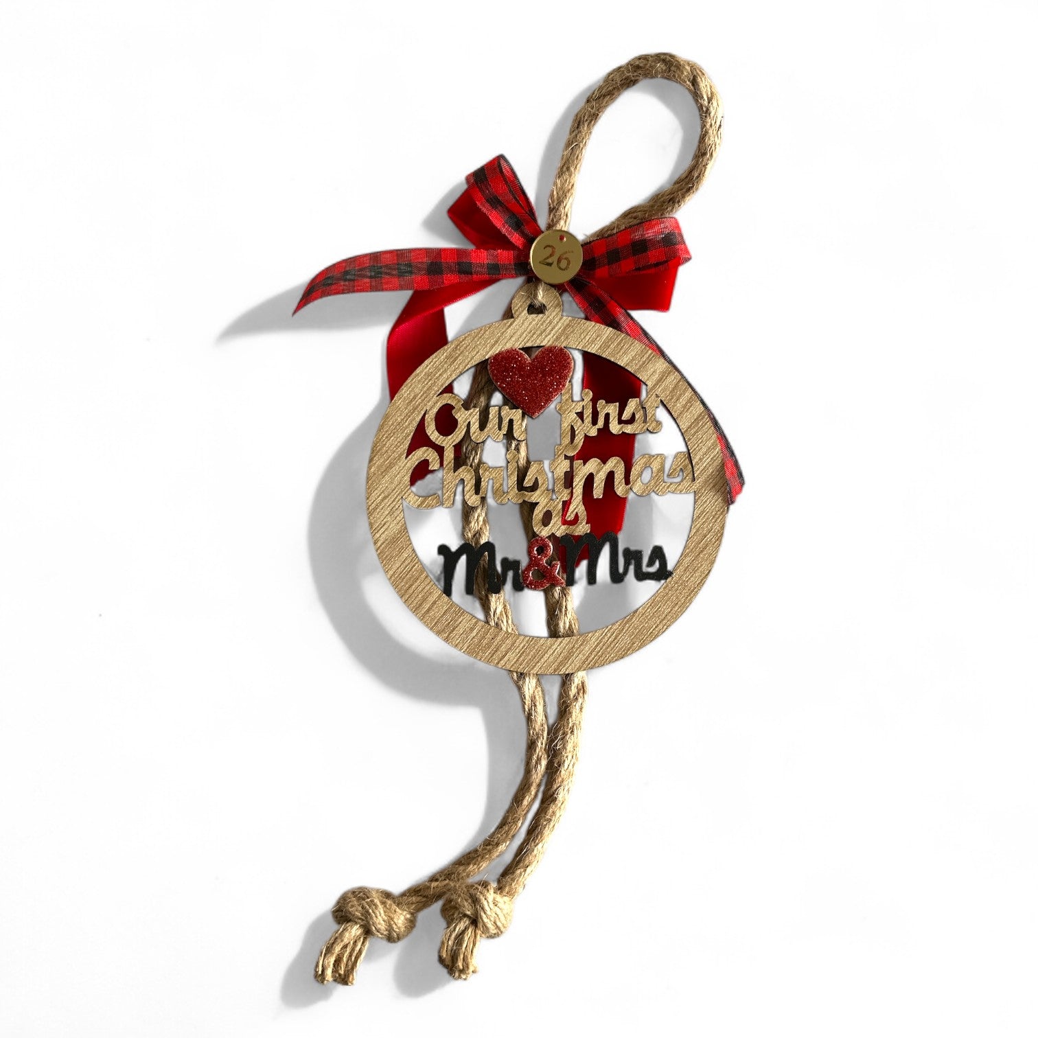 Το ξύλινο στοιχείο “Our First Christmas as Mr & Mrs” είναι βαμμένο στο χέρι με γκλίτερ, ενώ οι κορδέλες από σατέν, καρό και γκλίτερ συνδυάζονται με κορδόνι λινάτσας σε γήινους τόνους.