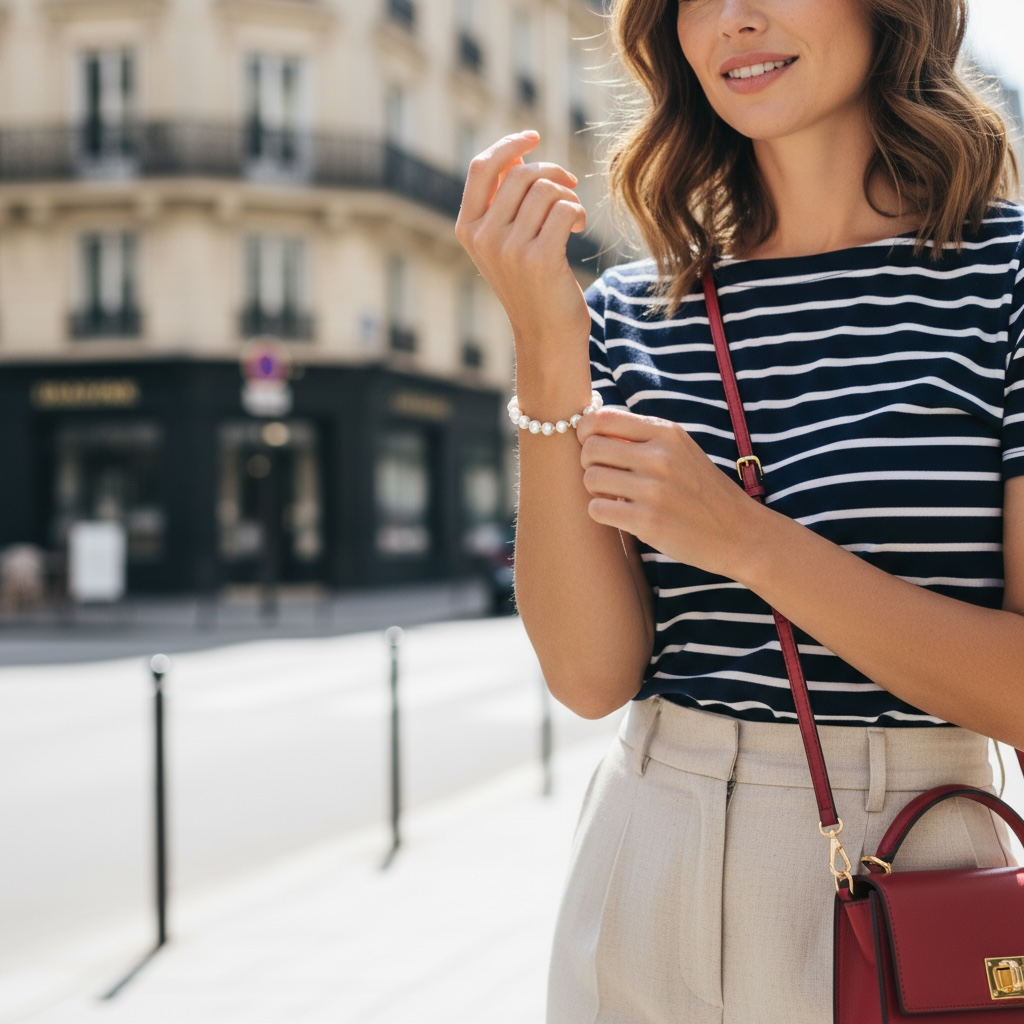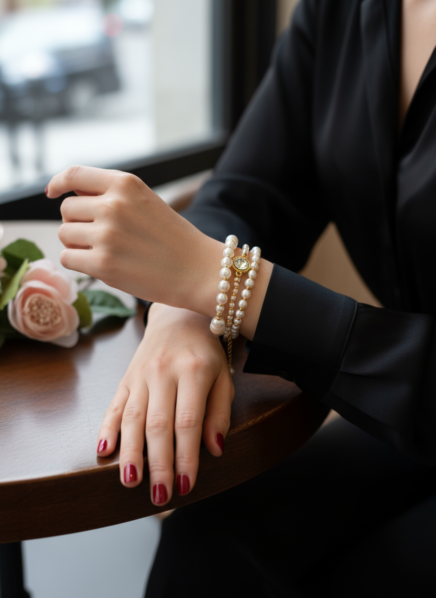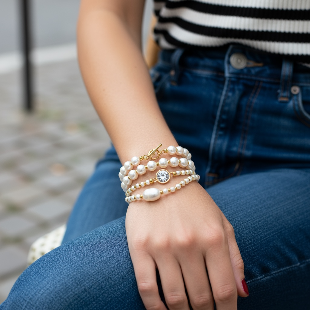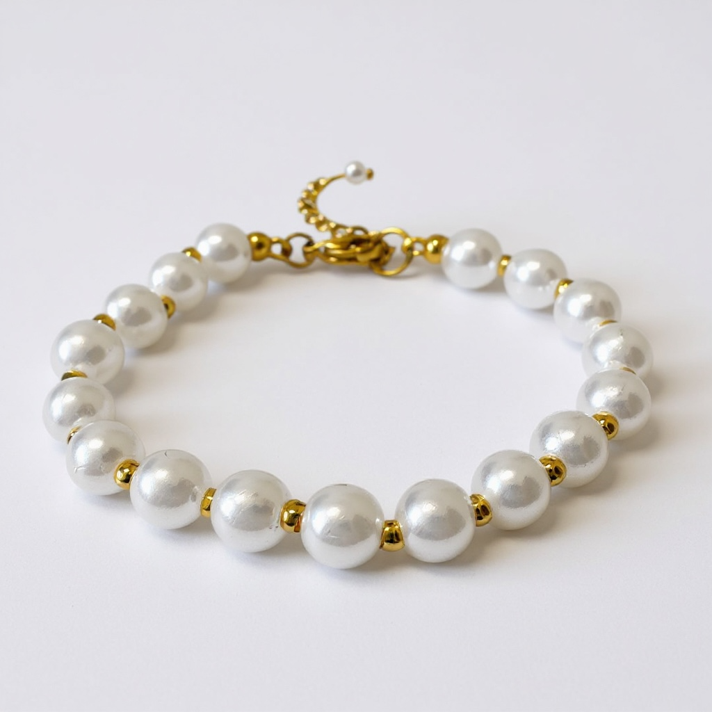 Χειροποίητο βραχιόλι με πέρλες διαμέτρου 8mm και επίχρυσες ορειχάλκινες χάντρες. Ατσάλινο κούμπωμα