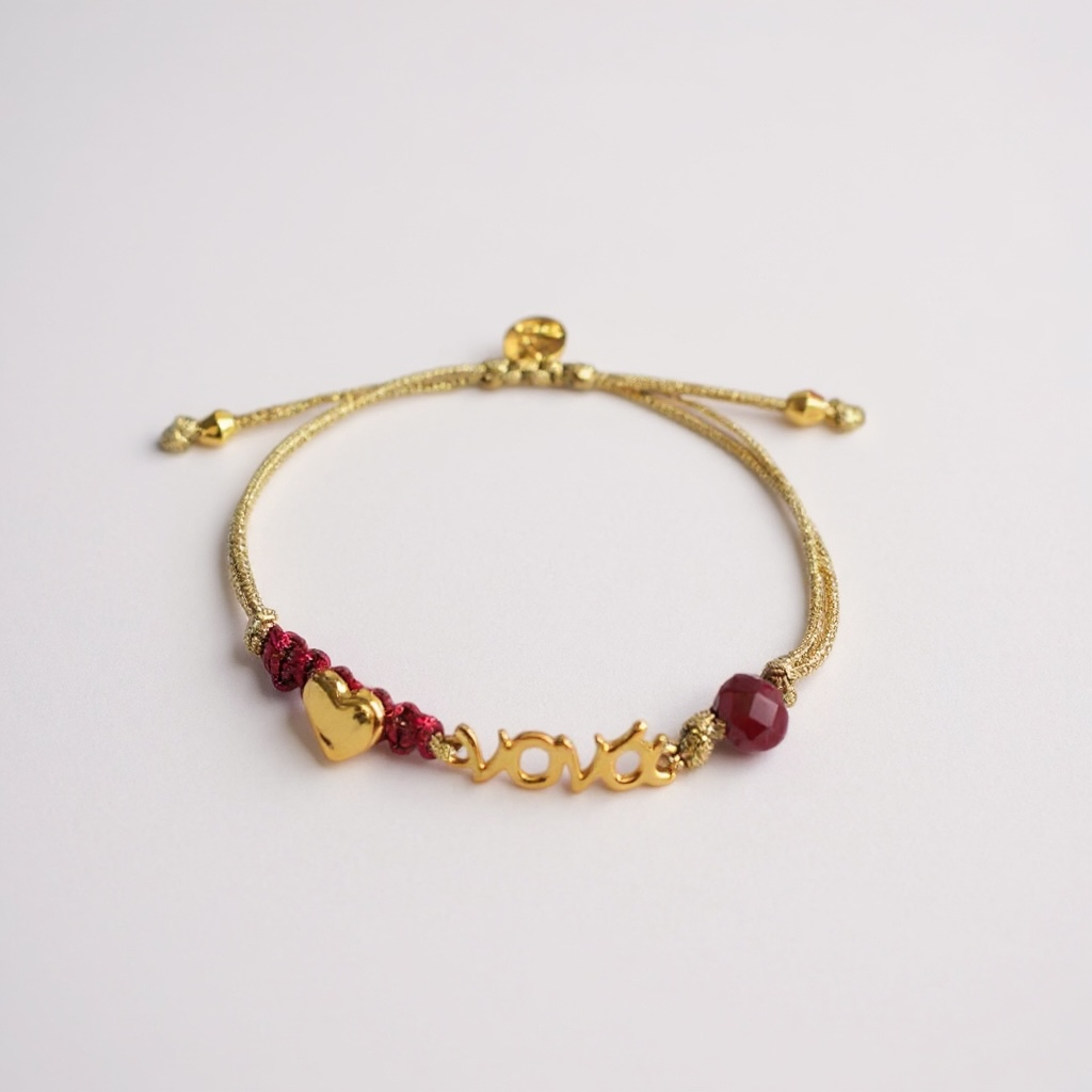 Χειροποίητο βραχιόλι με διπλό μεταλλικό κορδόνι, ταυτότητα, κρυστάλλινη χάντρα και περαστή καρδιά. Από ορείχαλκο ελληνικής κατασκευής υψηλής ποιότητας, επιχρυσωμένο στα 24 καράτια. One size.