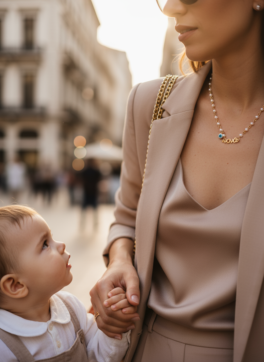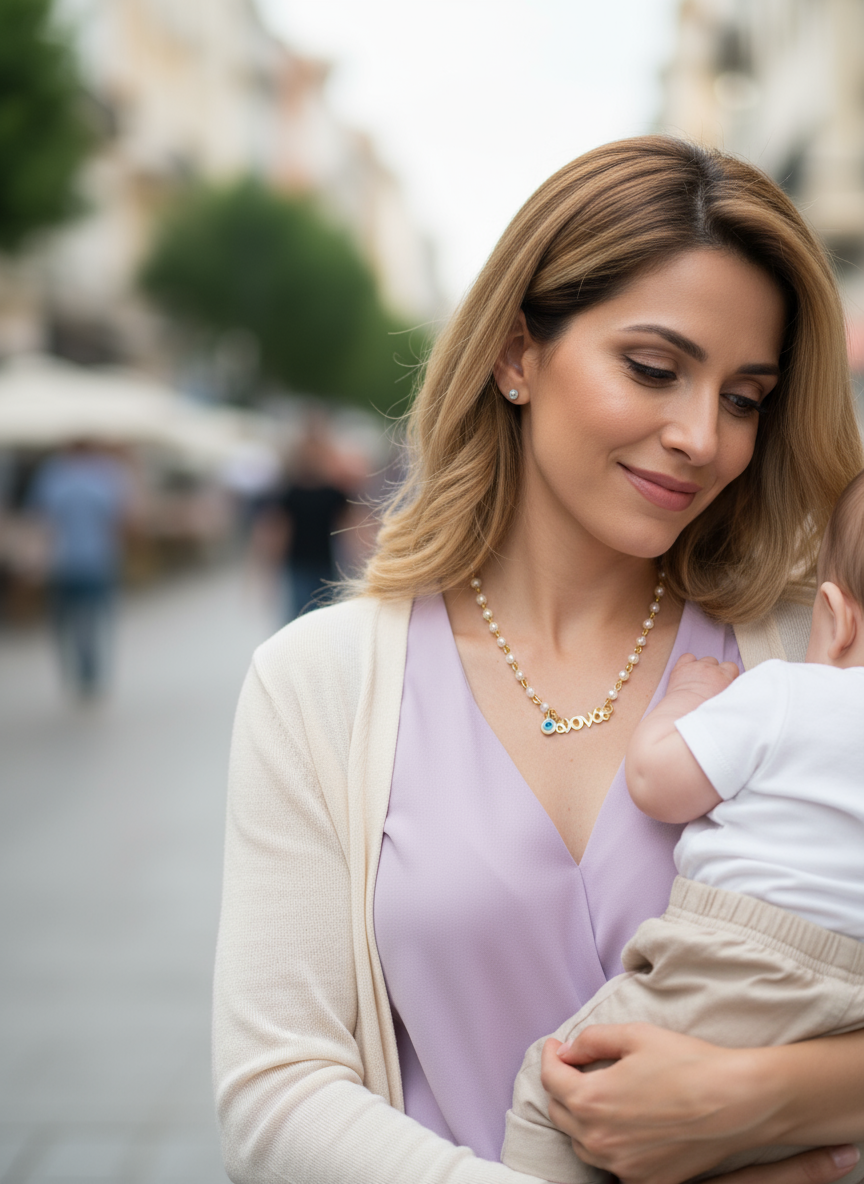 Με αλυσίδα ροζάριο από γυάλινες πέρλες, επίχρυση ταυτότητα “Νονά” και μίνι charm ματάκι, είναι το τέλειο δώρο για τη νονά που αγαπάς και θες να της δείξεις πόσο ξεχωριστή είναι.