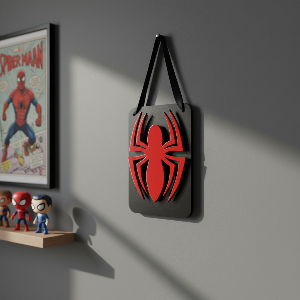 Το iconic κόκκινο σύμβολο της αράχνης ξεχωρίζει πάνω στη μαύρη ξύλινη βάση, δημιουργώντας ένα statement decor στοιχείο που δίνει χαρακτήρα σε κάθε αγορίστικο δωμάτιο.