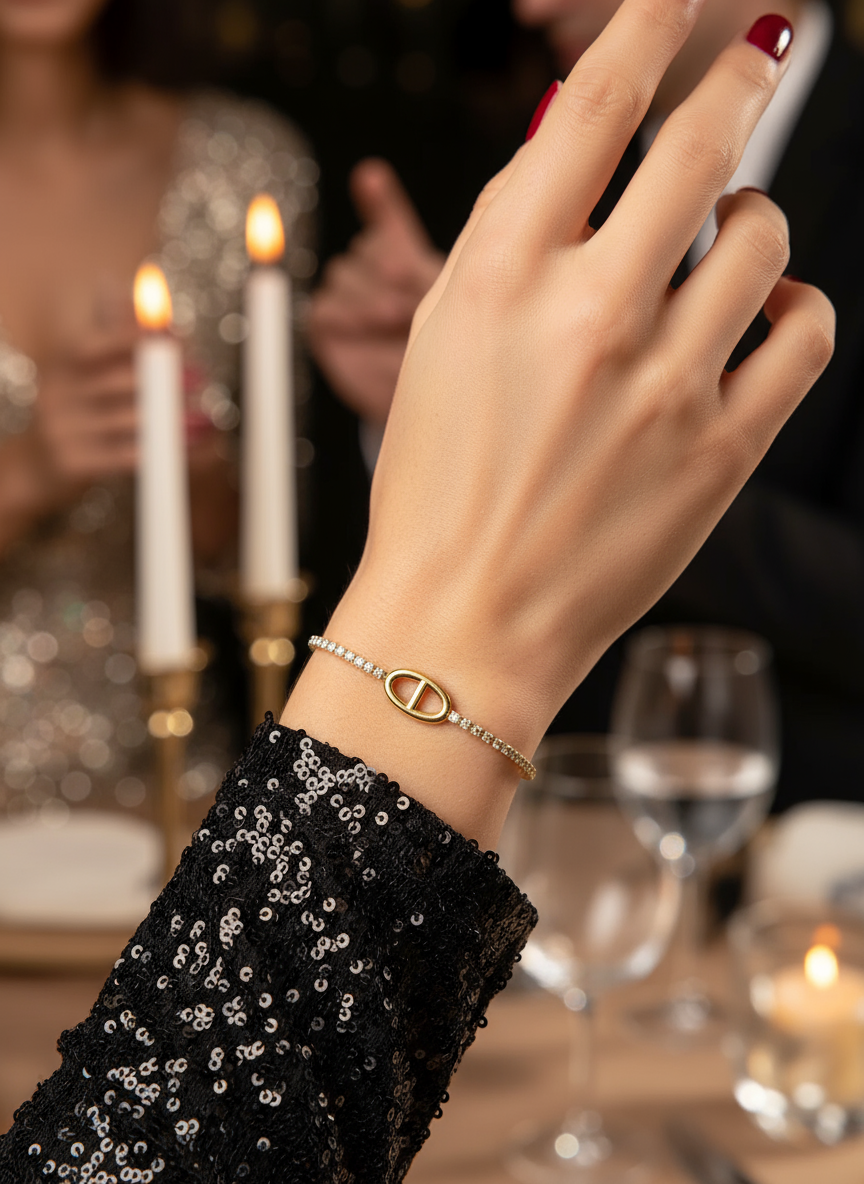 Το Stellar Shine είναι ένα εκθαμβωτικό ατσάλινο βραχιόλι που συνδυάζει την κομψότητα του after-dark glam με τον διακριτικό δυναμισμό του μινιμαλισμού. Η αλυσίδα είναι διακοσμημένη με λαμπερά στρας που παίζουν με το φως σε κάθε κίνηση, ενώ το εμβληματικό οβάλ μοτίφ τύπου “θ” ολοκληρώνει την εμφάνιση με μοντέρνο twist. Διατίθεται σε χρυσό και ασημί για να επιλέξεις ανάλογα με τη διάθεσή σου.